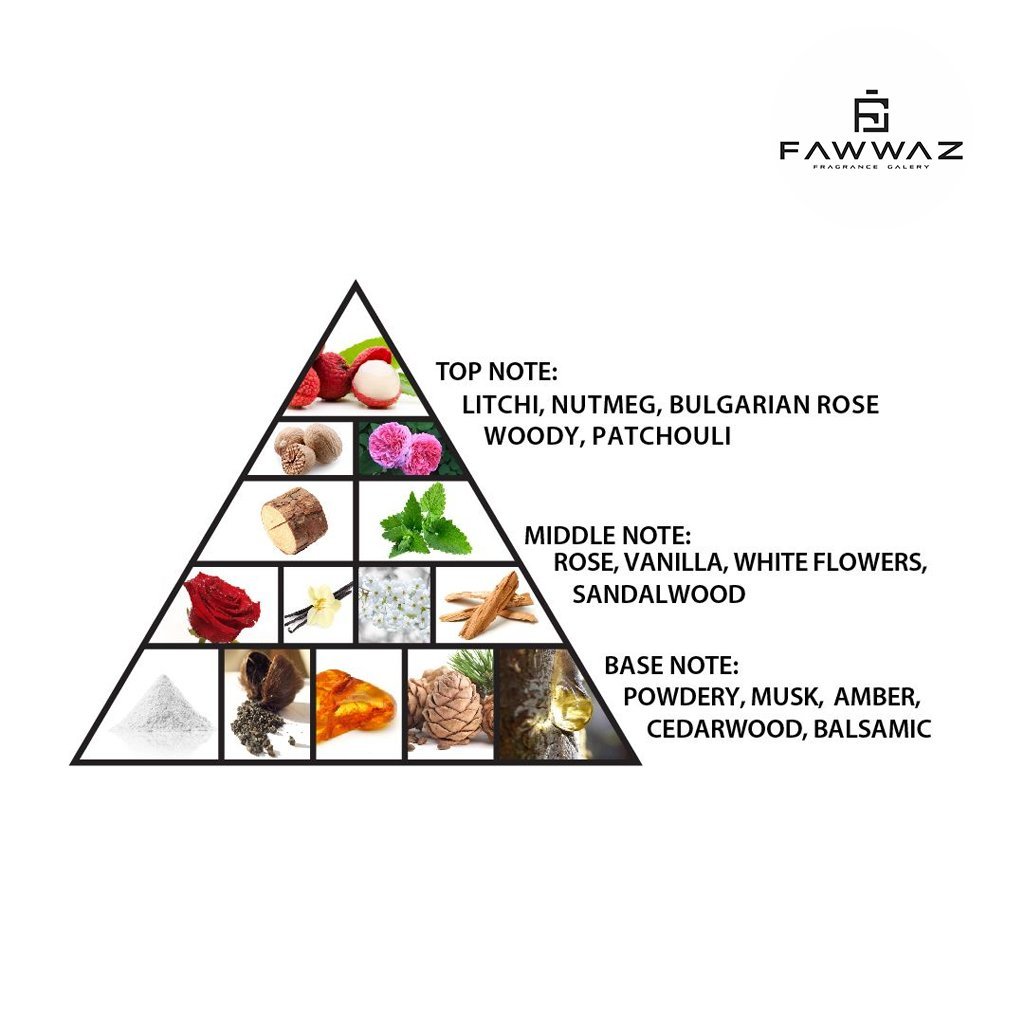 Top Notes: Litchi segar, Bulgarian Rose mewah, berpadu dengan sentuhan Nutmeg, Patchouli & Woody Notes – menimbulkan kesan penuh misteri dan keanggunan.
