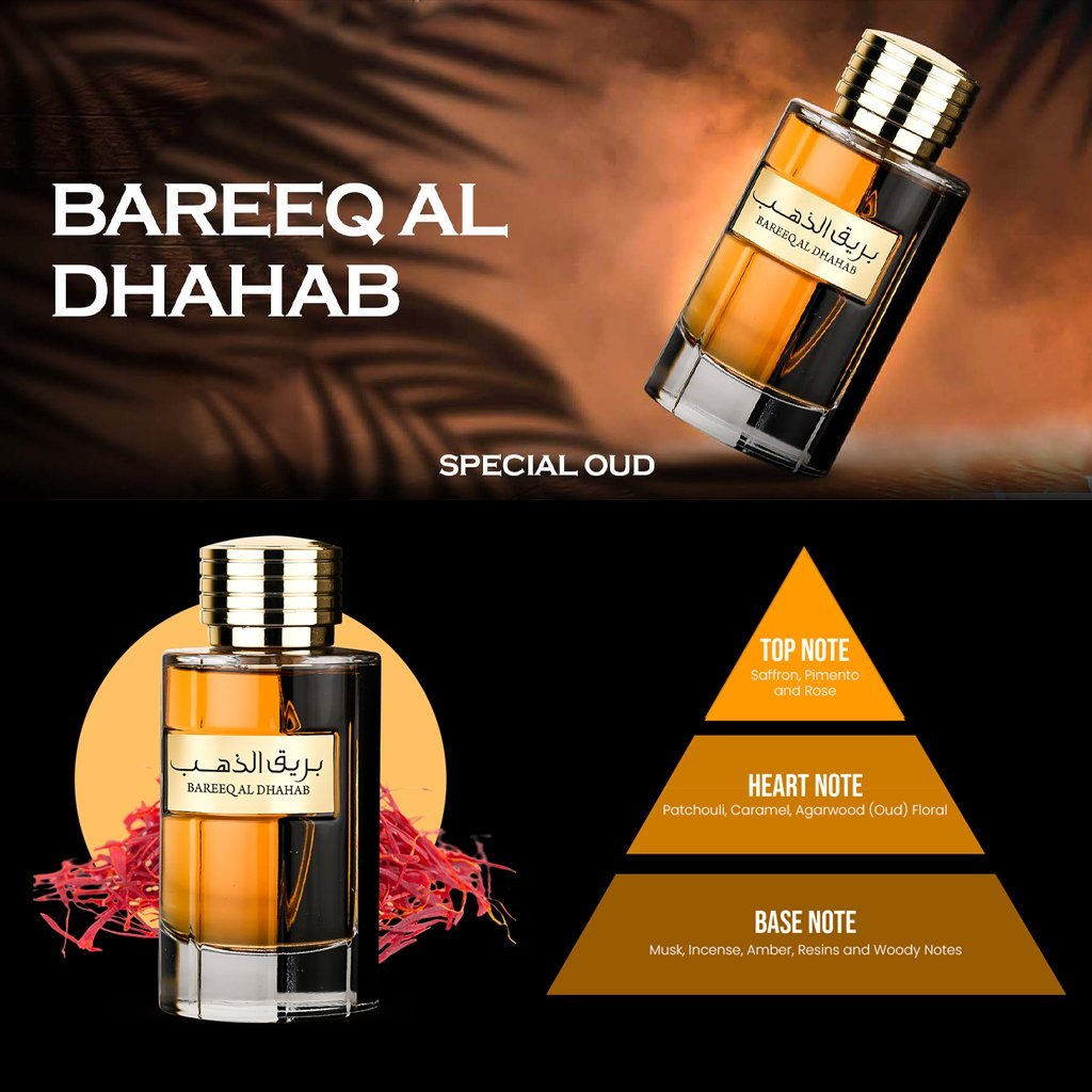 Bareeq Al Dhahab Eau de Parfum – parfum unisex dengan aura kemewahan dan pesona tiada tanding.