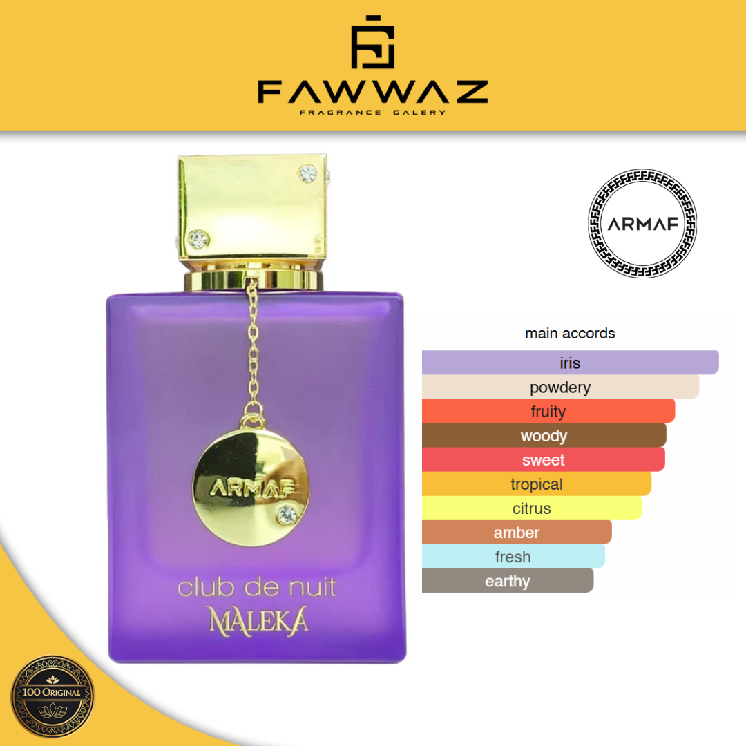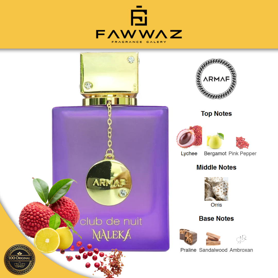 Armaf Club De Nuit Maleka adalah parfum dengan aroma yang memadukan nuansa manis, floral, dan creamy yang lembut, menciptakan kesan mewah namun tetap nyaman digunakan sehari-hari maupun untuk acara spesial.