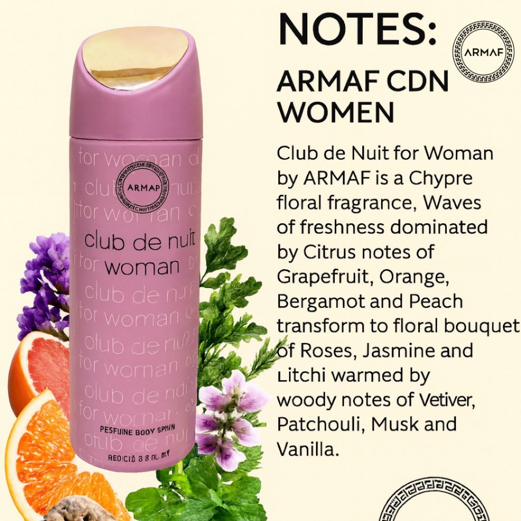 Body spray dengan aroma feminin yang elegan dan segar. Perpaduan fruity–citrus di awal, floral yang lembut di tengah, serta sentuhan vanilla–musk yang hangat di akhir. Ringan, nyaman, dan cocok dipakai setiap hari.