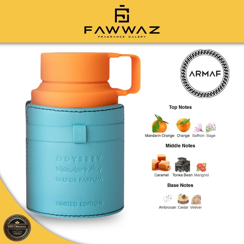 Armaf Odyssey Mandarin Sky Limited Edition EDP 100ml adalah parfum pria mewah dengan sentuhan citrus segar dari jeruk mandarin yang berpadu dengan aroma spicy, floral, dan woody. Cocok untuk pria yang ingin tampil percaya diri, maskulin, dan stylish.