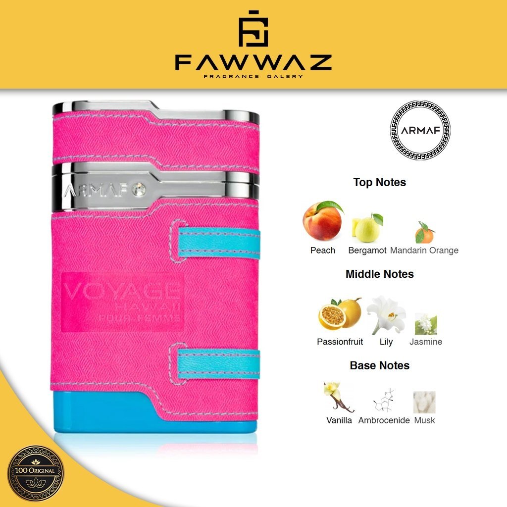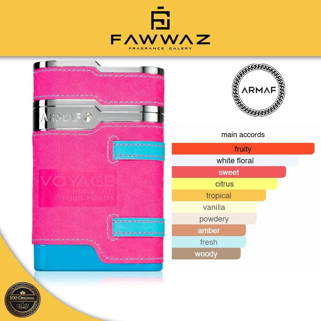 Armaf Voyage Hawai Pour Femme Pink EDP 100ml adalah parfum wanita dengan aroma floral fruity yang segar, ceria, dan feminin. Terinspirasi dari keindahan tropis Hawai, parfum ini menghadirkan wangi yang playful namun tetap elegan, cocok untuk wanita modern yang ingin tampil percaya diri setiap hari.