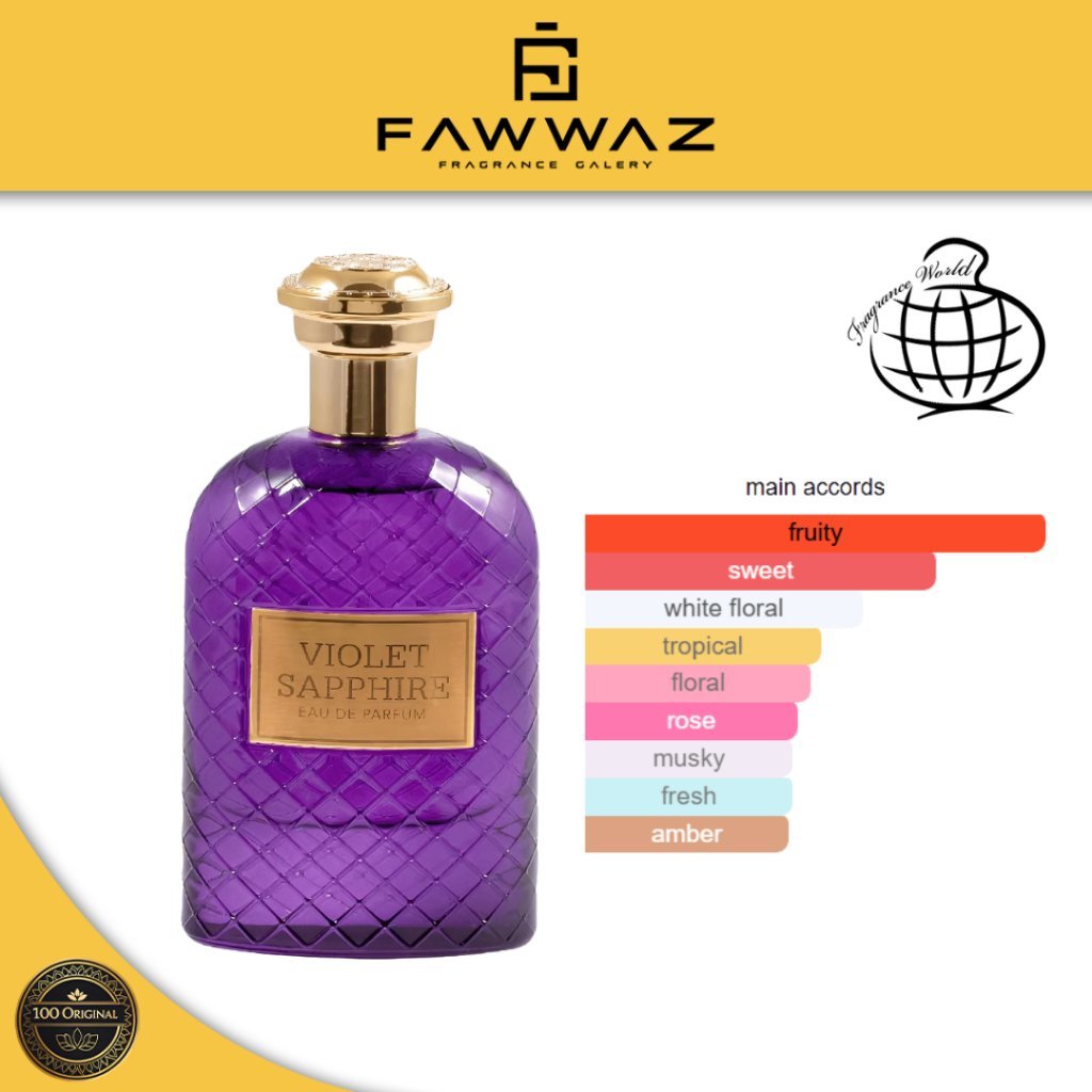 Violet Sapphire Eau de Parfum adalah parfum wanita dengan aroma mewah, elegan, dan feminin. Perpaduan buah-buahan segar, bunga yang lembut, serta sentuhan kayu dan amber membuat parfum ini terasa glamor dan berkelas. Cocok untuk dipakai harian maupun acara spesial.