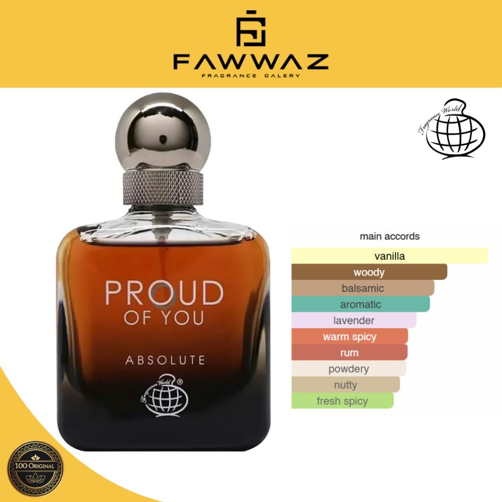 Proud Of You Absolute adalah parfum yang menghadirkan keseimbangan antara aroma segar citrus di awal dengan sentuhan hangat amber dan woody di akhir, menghasilkan karakter aroma mewah, tegas, dan maskulin elegan.