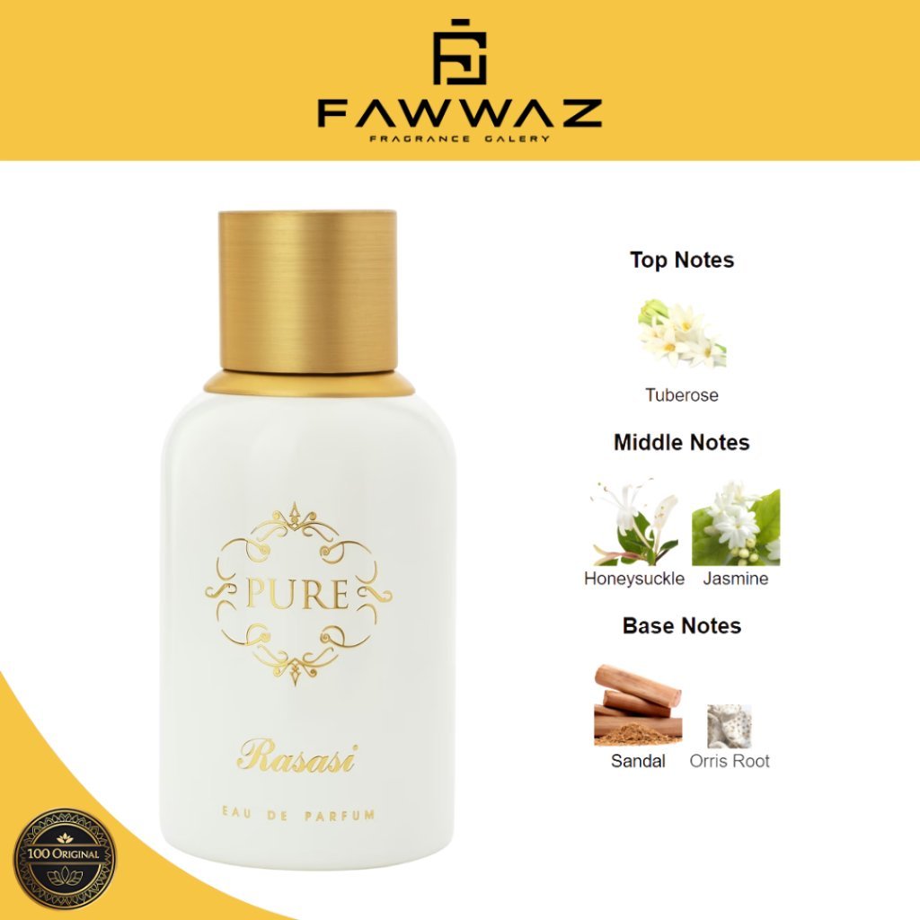 Rasasi Pure Pour Femme Eau de Parfum 100ML adalah parfum elegan dengan aroma bunga putih yang lembut dan feminin, menghadirkan kesan bersih, anggun, serta menenangkan. Di awal semprotan, wangi bunga tuberose yang memikat berpadu dengan keharuman jasmine dan honeysuckle yang manis di tengah, menciptakan perpaduan aroma floral yang segar dan menawan. Sentuhan akhir dari orris root dan sandalwood memberikan nuansa lembut dan creamy yang menambah kehangatan sekaligus kesan mewah pada parfum ini.