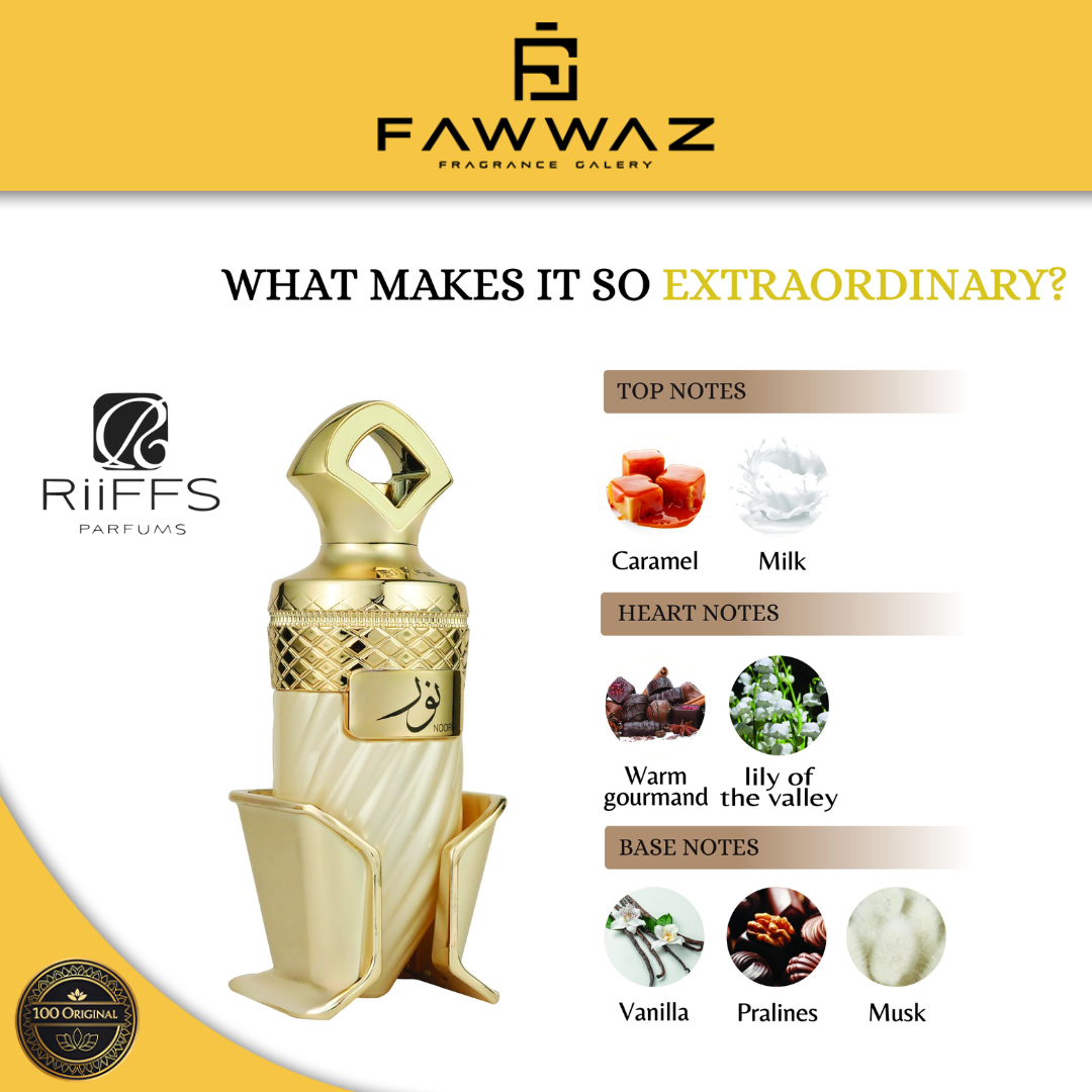 Riiffs Noor adalah parfum unisex dengan karakter lembut, hangat, dan elegan. Aromanya memadukan nuansa manis yang smooth dengan sentuhan amber dan creamy yang menenangkan, menciptakan kesan bersih, mewah, dan berkelas. Wanginya tidak menusuk, cocok untuk penggunaan harian maupun momen spesial.