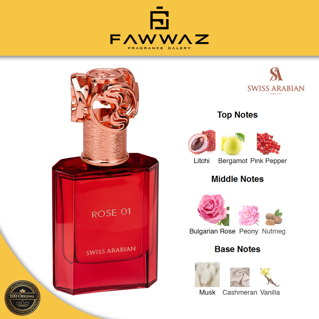 Swiss Arabian Rose 01 adalah parfum unisex dengan karakter floral rose yang elegan dan modern. Aromanya menampilkan mawar yang lembut dan bersih, dipadukan dengan sentuhan fresh dan musky yang halus, menciptakan kesan anggun, mewah, dan berkelas tanpa terkesan berlebihan. Cocok untuk pencinta aroma rose yang soft dan sophisticated.