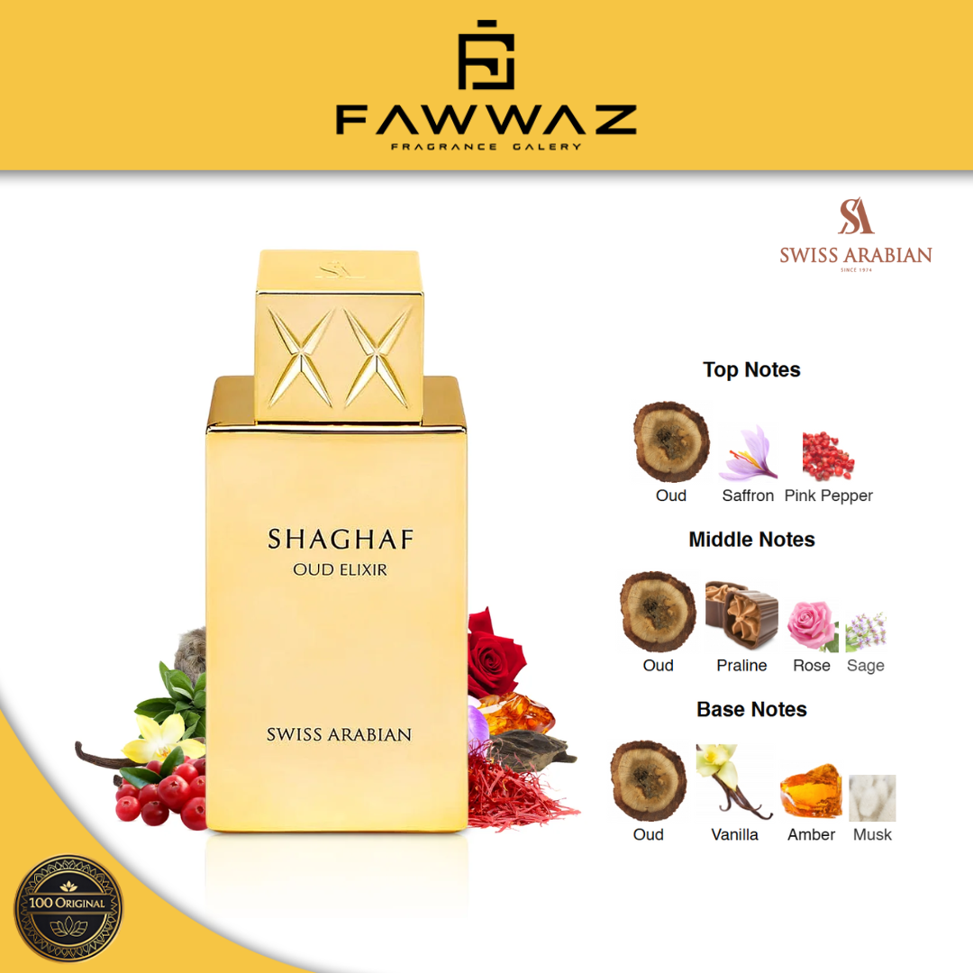 Swiss Arabian Shaghaf Oud Elixir adalah parfum unisex dengan karakter oud yang kaya, warm, dan mewah. Aromanya memadukan oud yang dalam dengan sentuhan amber, spicy, dan sweet resin, menghasilkan wangi yang intens, elegan, dan berkelas. Cocok untuk pencinta parfum oud modern dengan kesan luxury dan eksklusif.